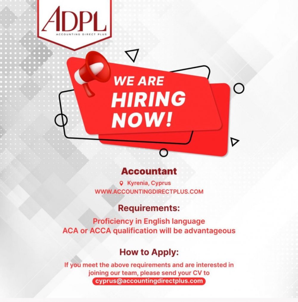 ADPL Muhasebeci arıyor! Yeterli derecede İngilizce bilmesi gerekir. ACA ve ACCA yeterliliği avantaj sağlyacaktır. Girne Kıbrıs cyprus@accountingdirectplus.com
