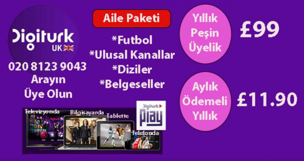 Digiturk Uk Aile Paketiyle İndirimleri Kaçırmayın! Futbol Ulusal Kanallar Diziler Belgeseller Yıllık Peşin Üyelik £99 Aylık Ödemeli Yıllık £11.90 020 8123 9043 Arayın Üye Olun