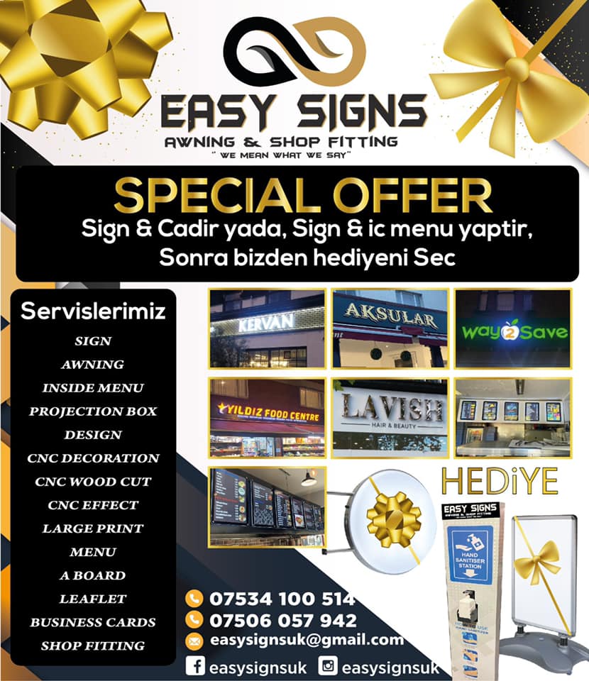 Easy Signs Awning & Shop Fitting Special Offer Sign&Cadir yada, Sign&iç mekan menü yaptır. Sonra bizden hediyeni seç!