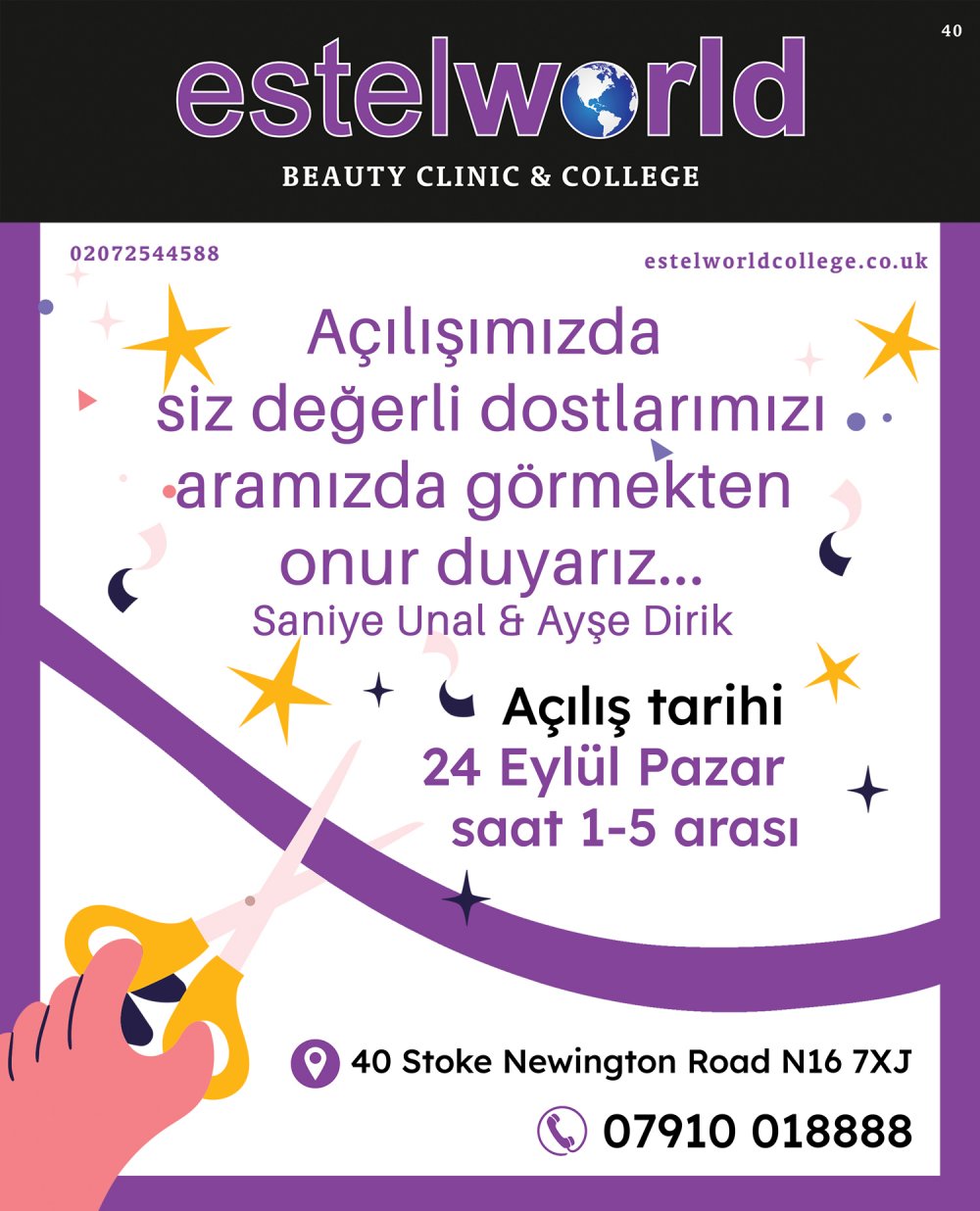 Saniye Ünal ve Ayşe Dirik ortaklığı ile Estelworld Güzellik Merkezinin yeni şubesi 40 Stoke Newington Road N16 7JX adresinde, 24 Eylül Pazar Günü saat 1-5 pm arasında açılışı yapılacaktır.