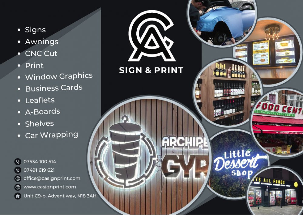 CA Sign & Print Signs Awnings CNC Cut Print Window Graphics Business Cards Leaflets A-Boards Shelves Car Wrapping 07534 100 514 07491 619 621 office@casignprint.com www.casignprint.com