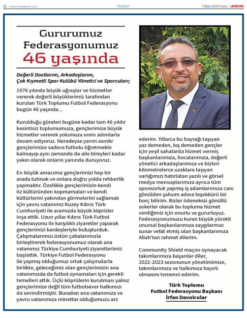 Neredeyse yarım asırdır gençlerimize sadece futbolu öğretmekle kalmayıp aynı zamanda da aile bireyleri kadar yakın olarak onların yanında duruyoruz. En büyük amacımız gençlerimizi hep bir arada tutmak ve onlara doğru yolda rehberlik yapmaktır. Özellikle gençlerimizin kendi kültürlerinden kopmamalarını ve kendi kültürlerini yakından görmelerini sağlamak için özellikle yavru vatanımız Kuzey Kıbrıs Türk Cumhuriyeti ile aramızda büyük köprüler inşaa ettik. Uzun yıllar Kıbrıs Türk Futbol Federasyonu ile karışıklı ziyaretler yaparak gençlerimizi kardeşleriyle buluşturduk. Buradan ana vatanımıza ve yavru vatanımıza minnattar olduğumuzu arz ederim.